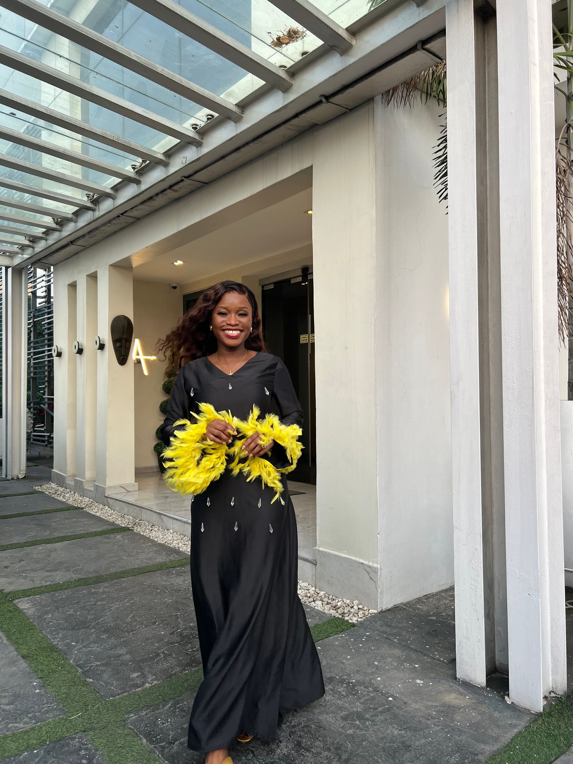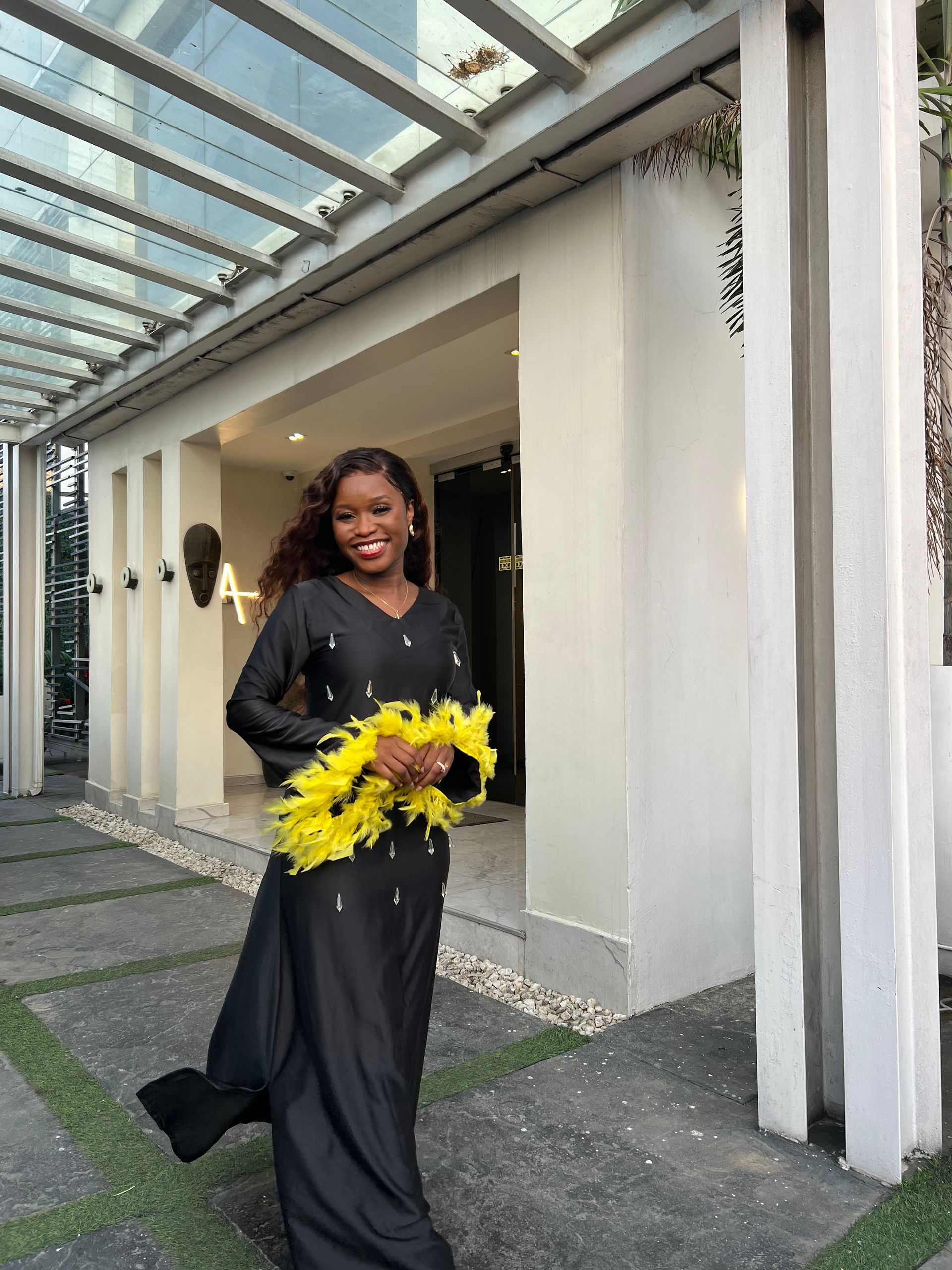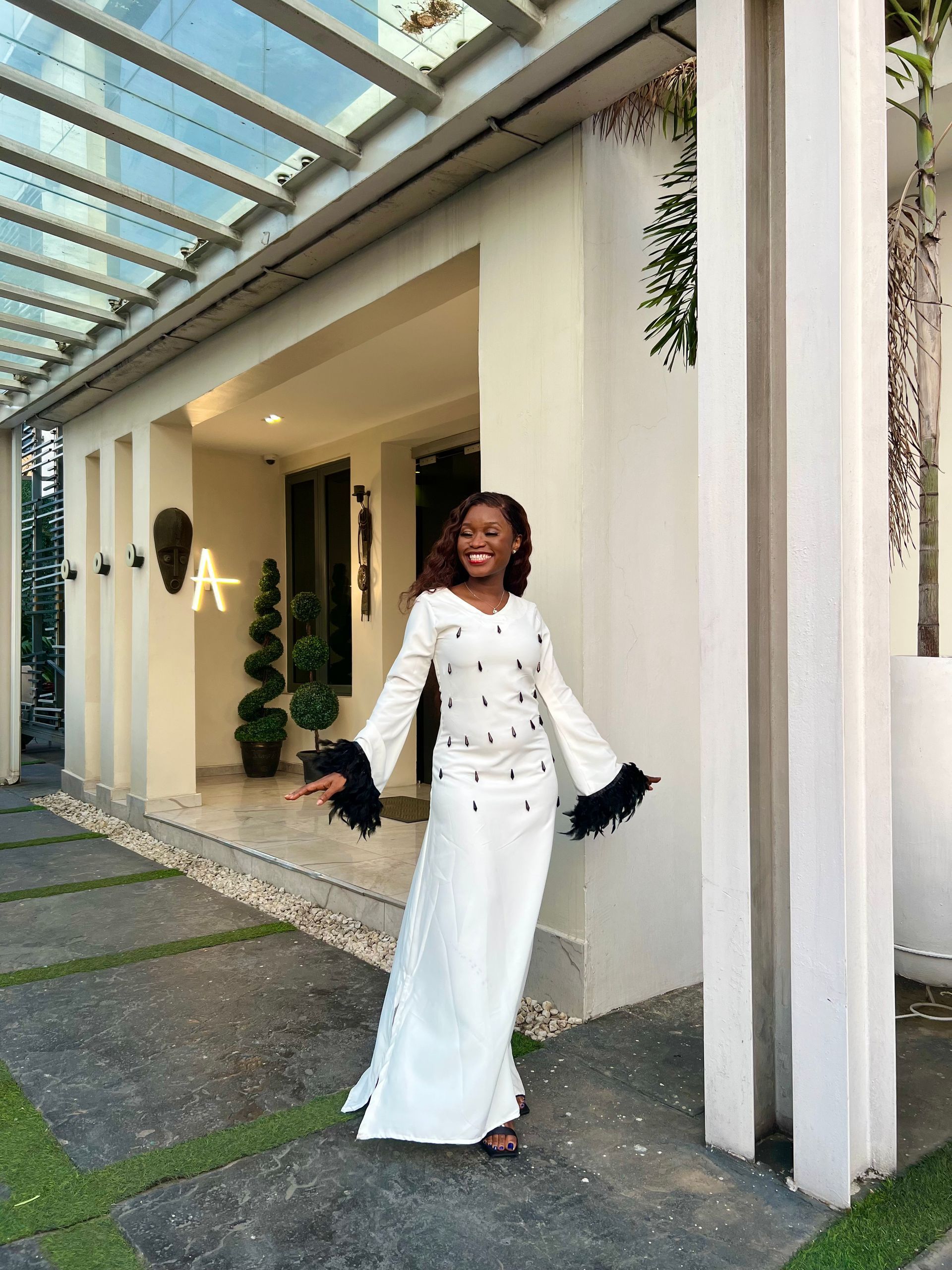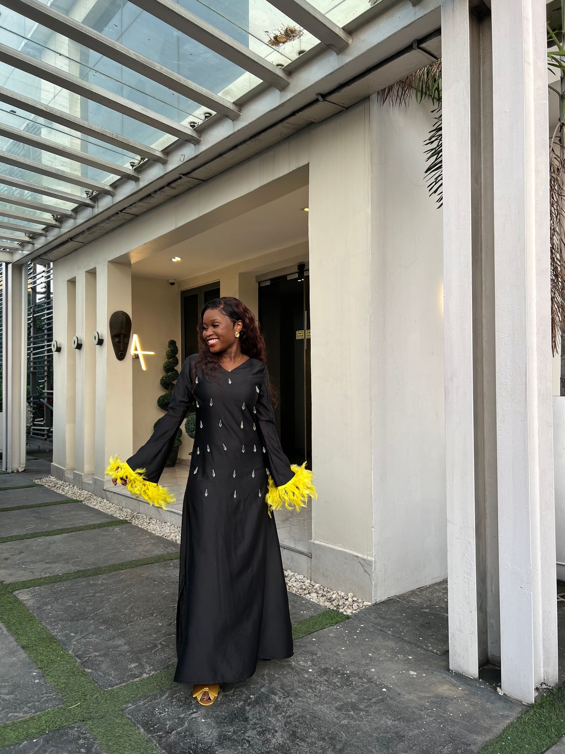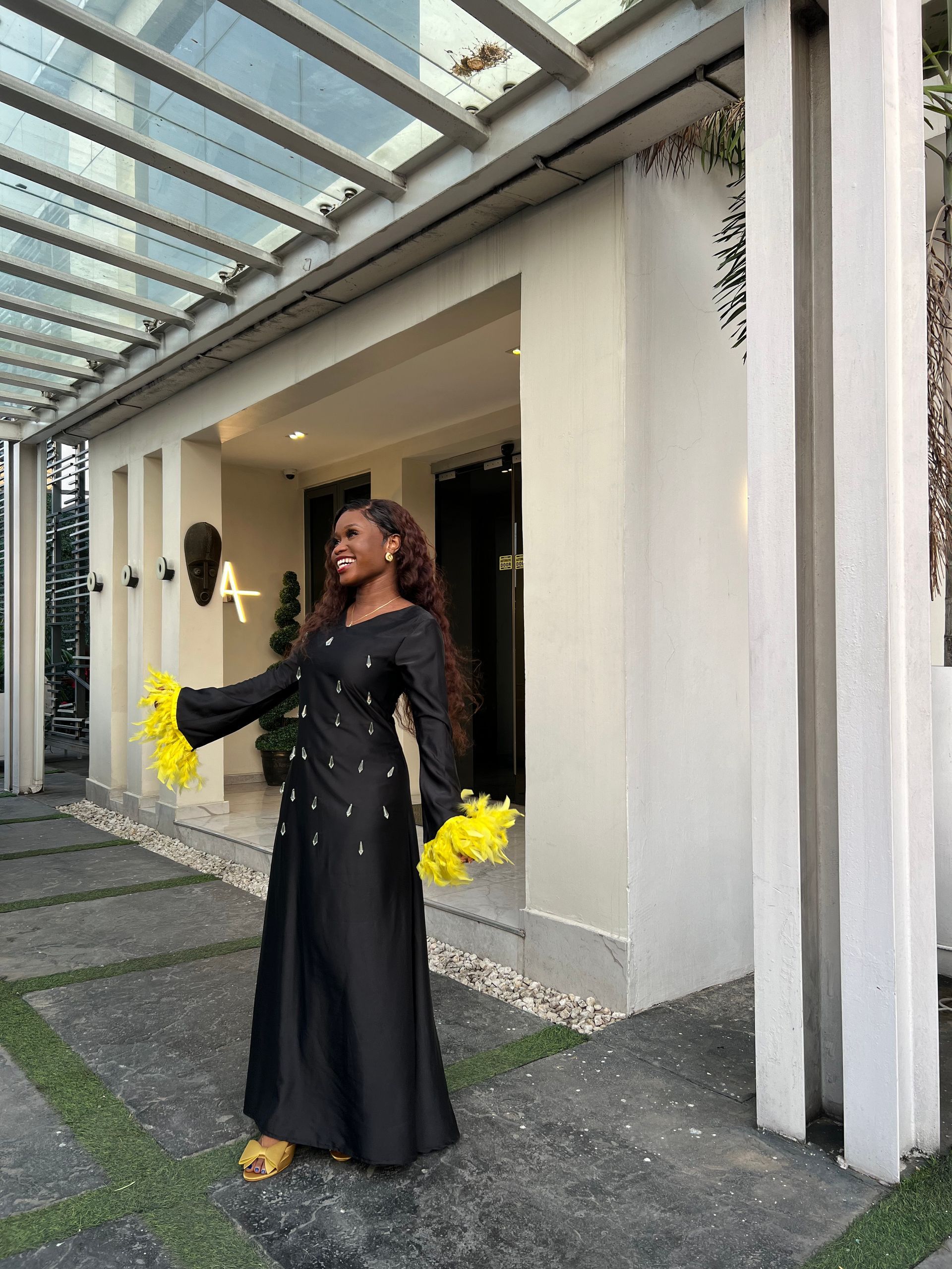 Crafted from Duchess/crepe and finished with bold feathered sleeve hems and sparkling droplets, the 'One Thing' dress demands attention in all the right ways. ✨🔥