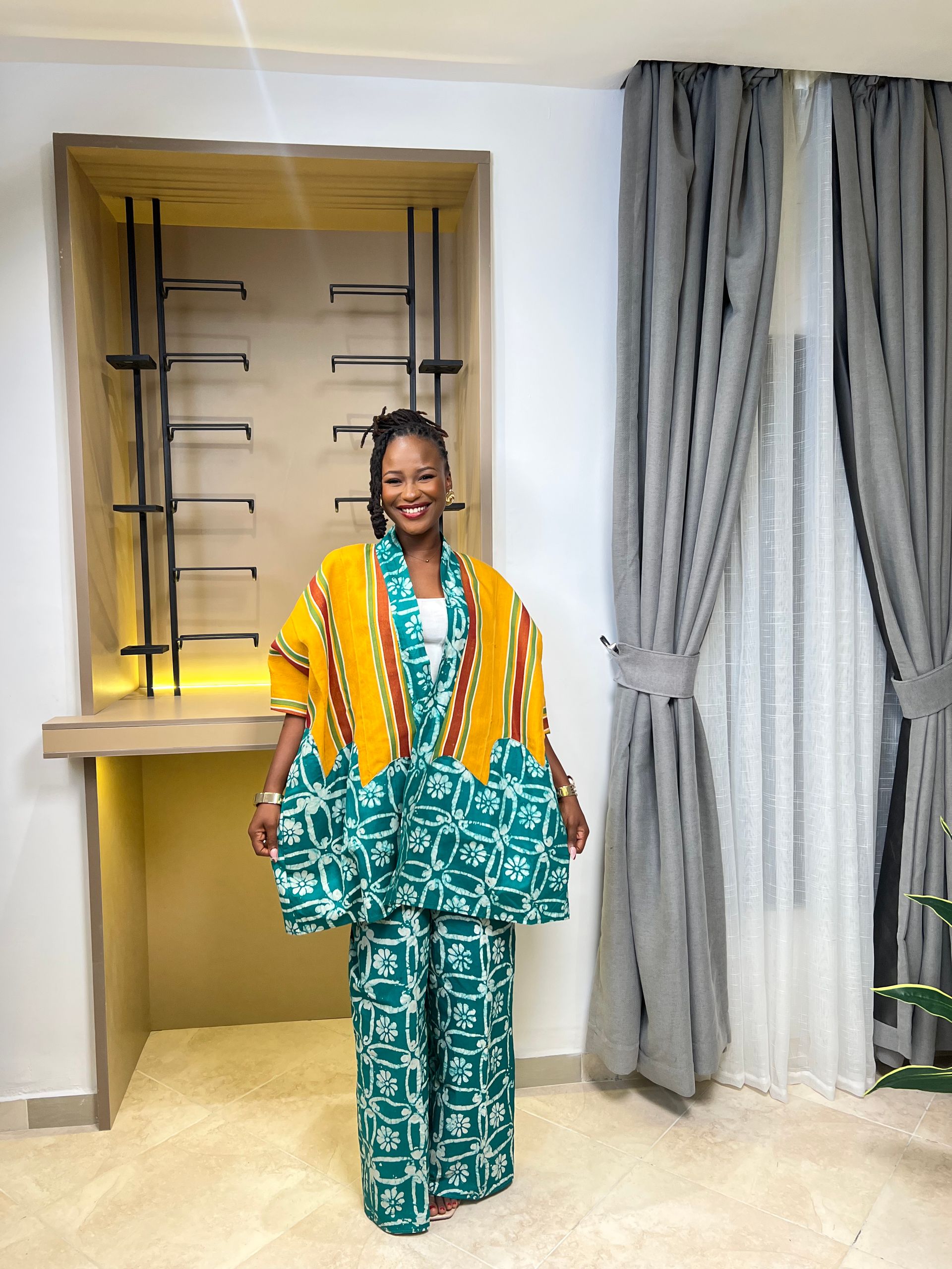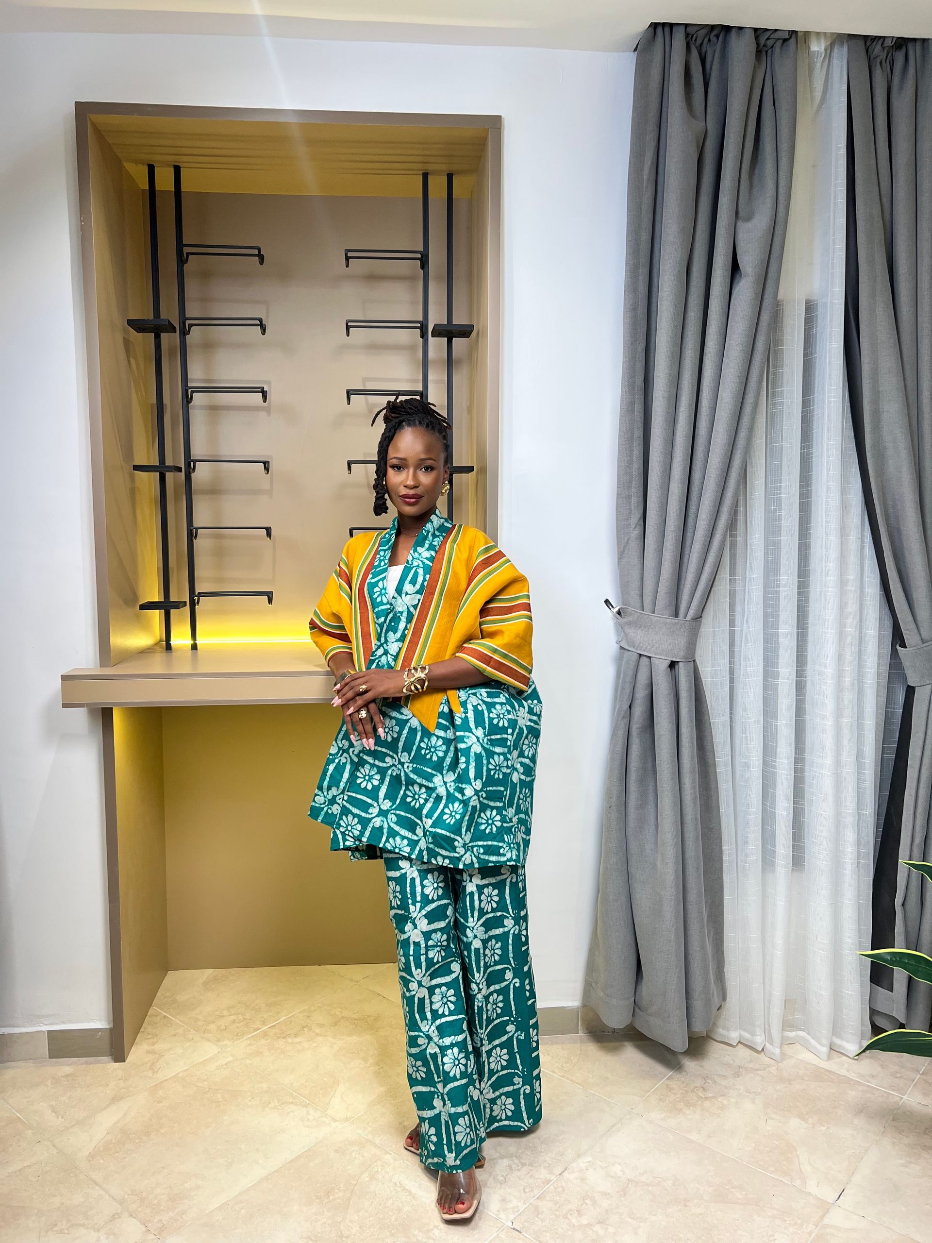 Adunbarin set is a set made from Adire and Asooke. Kimono paired with pants.