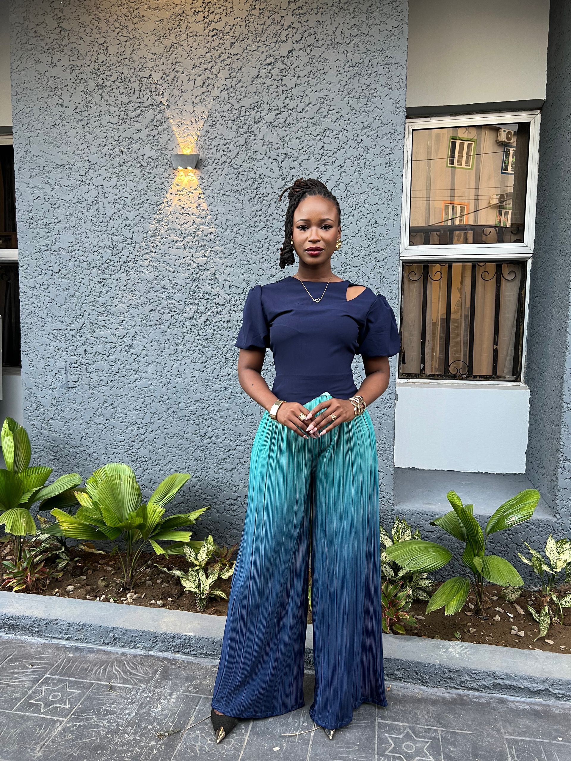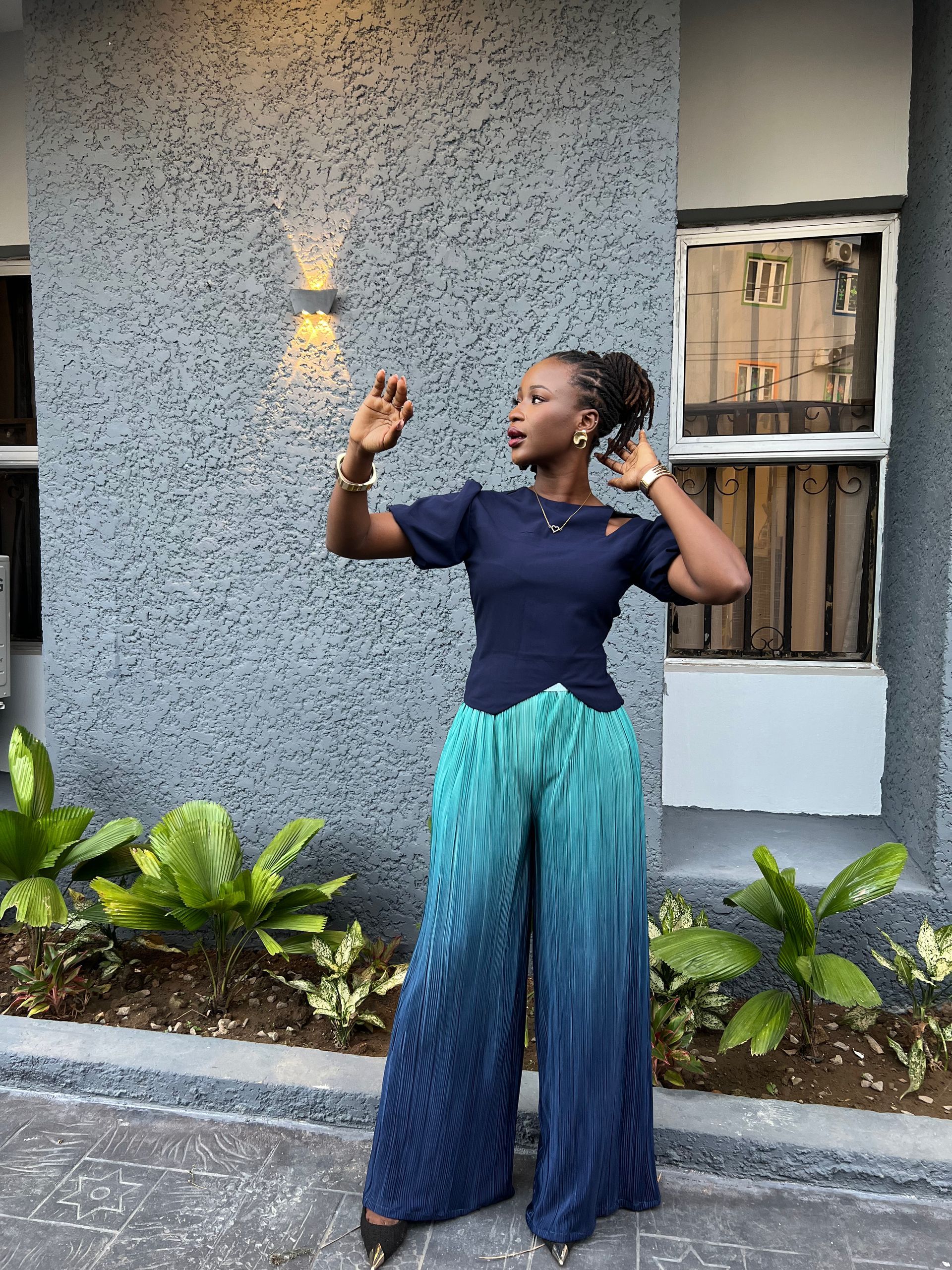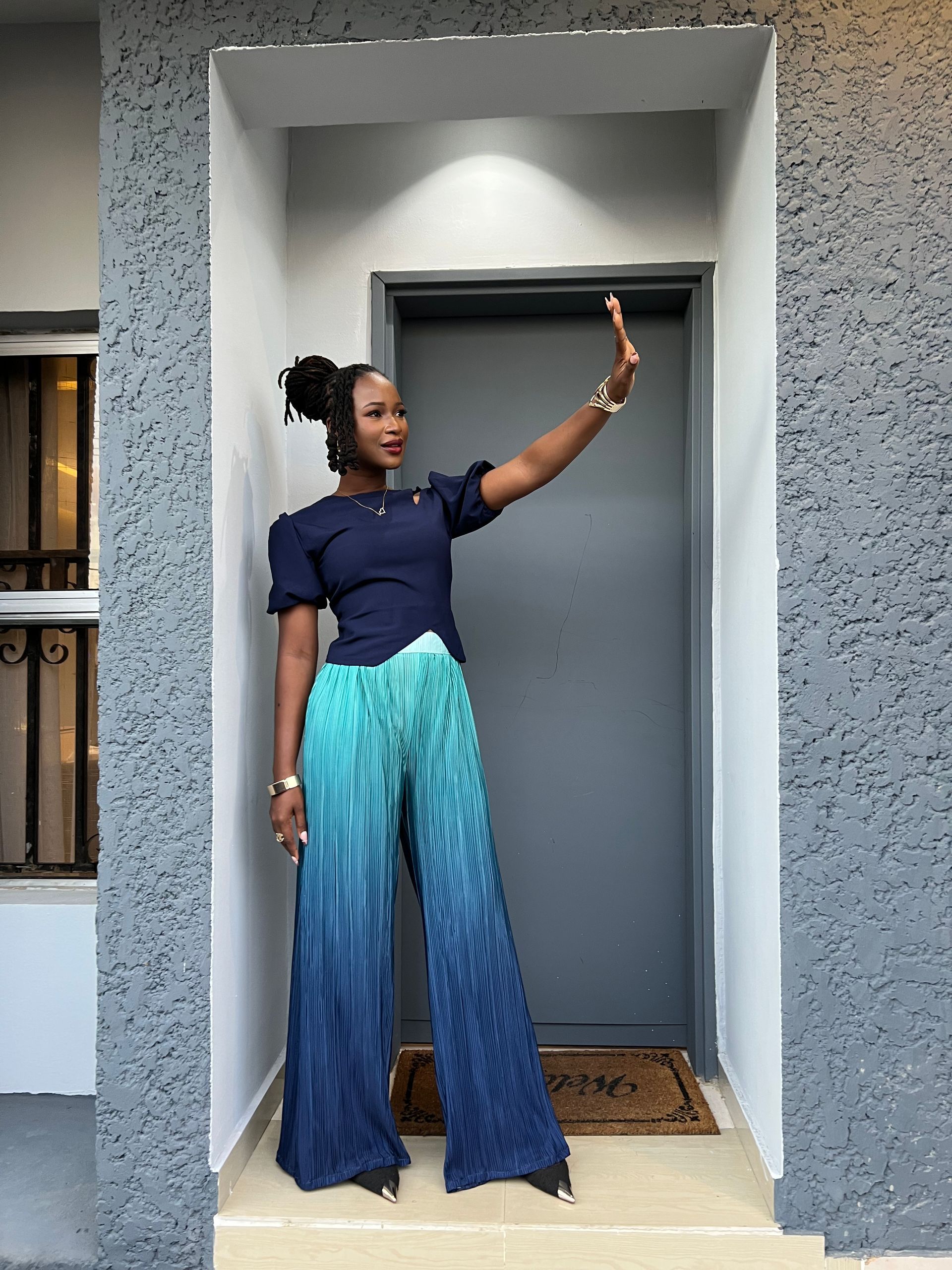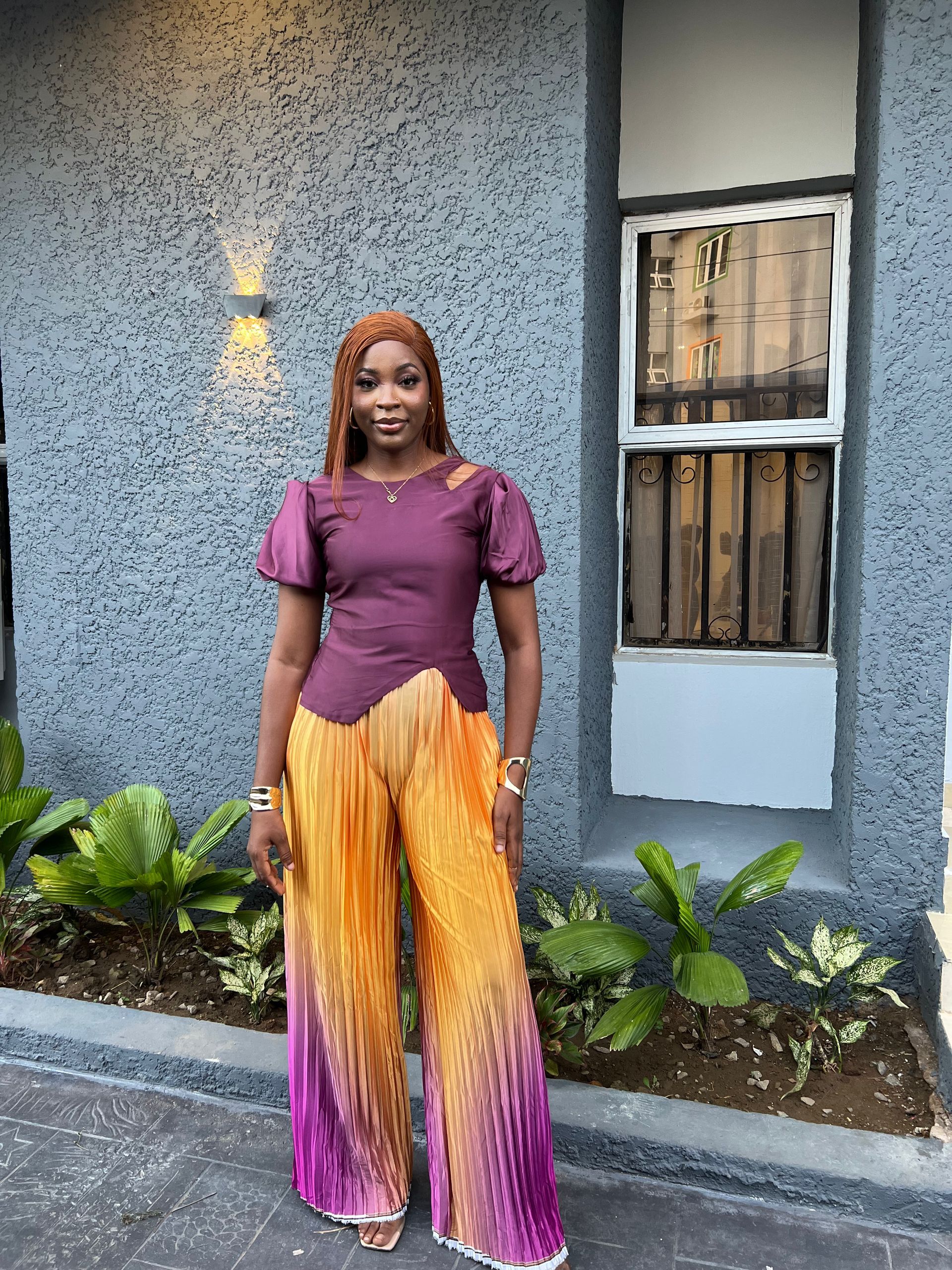 Alheri set - a plain color blouse with puff sleeves with an opening on the left shoulder, paired a miyaki colored pants