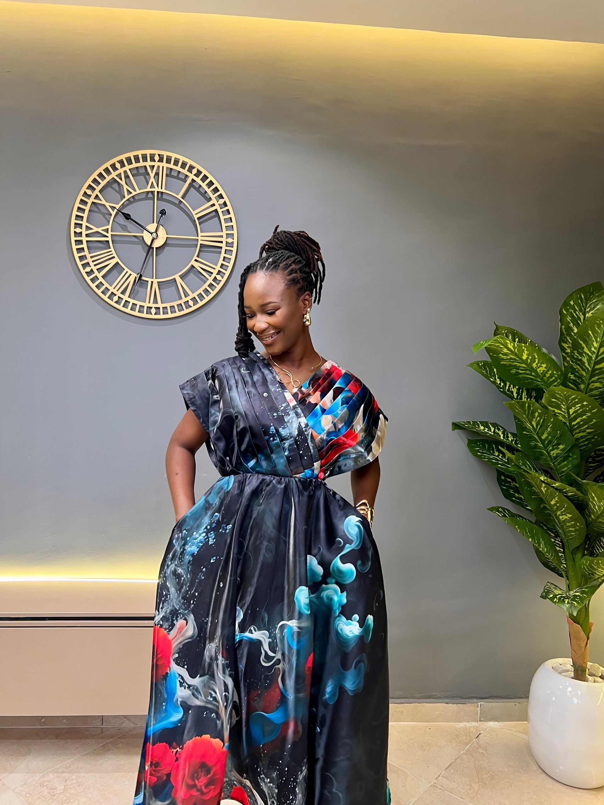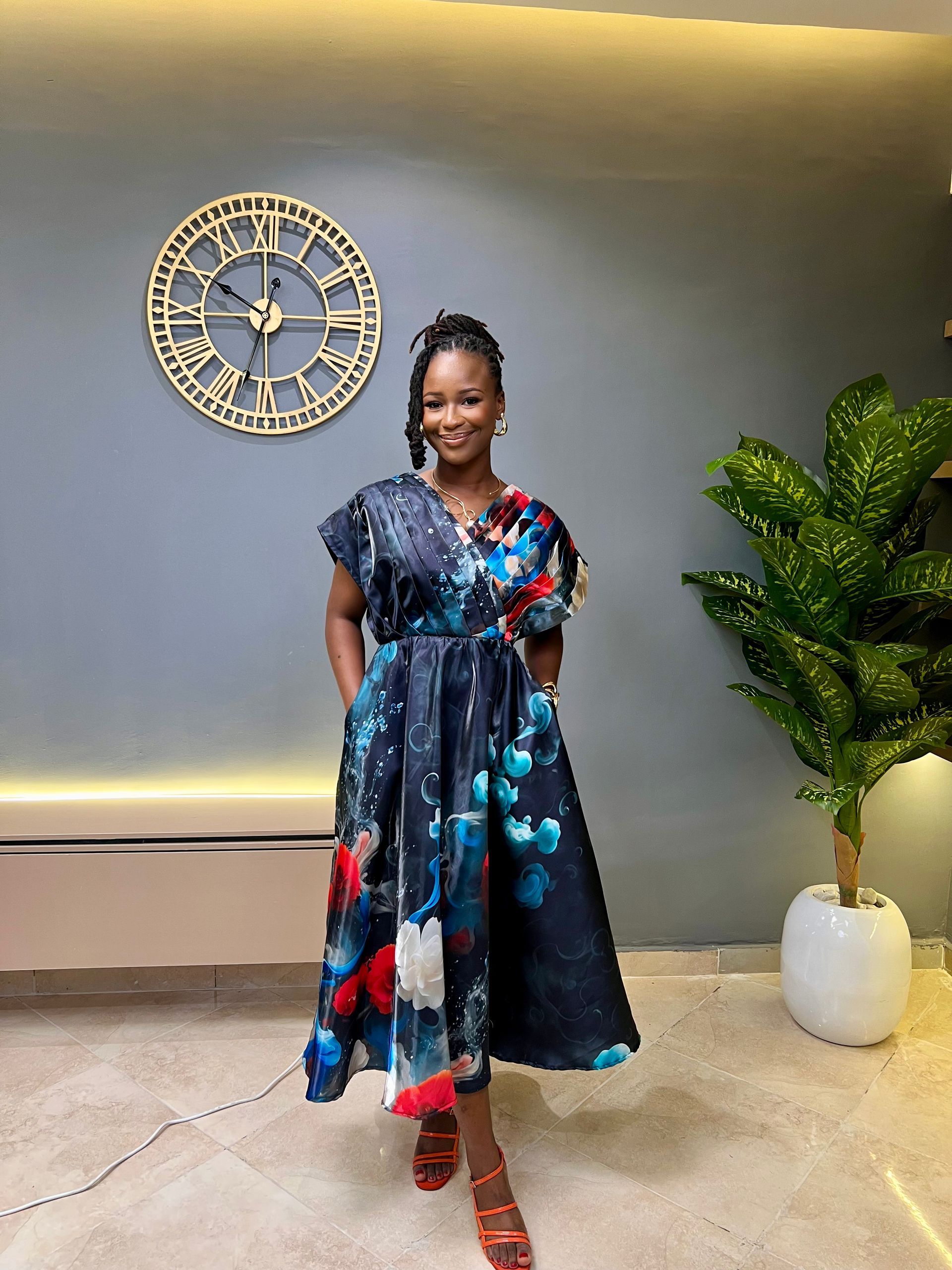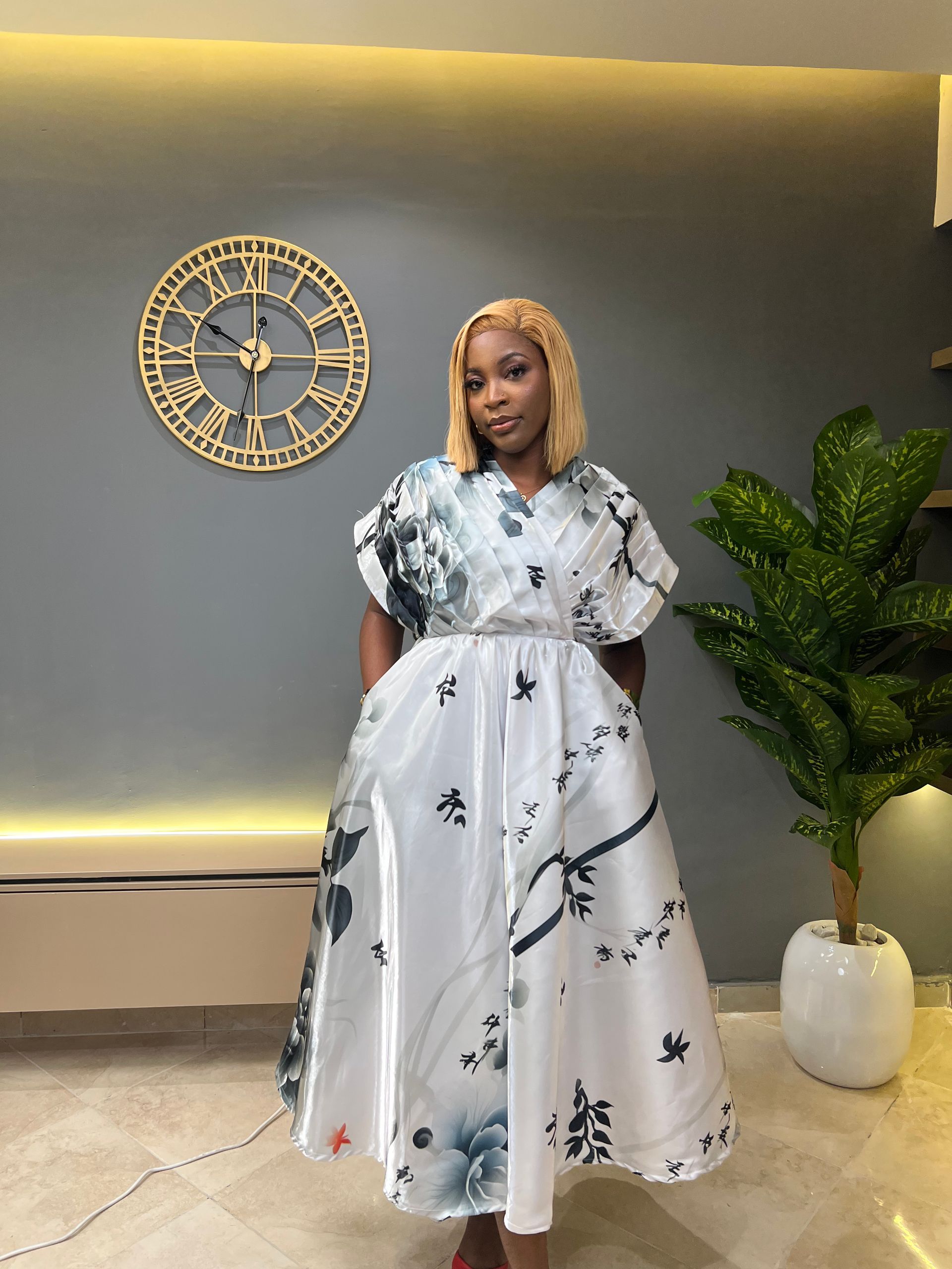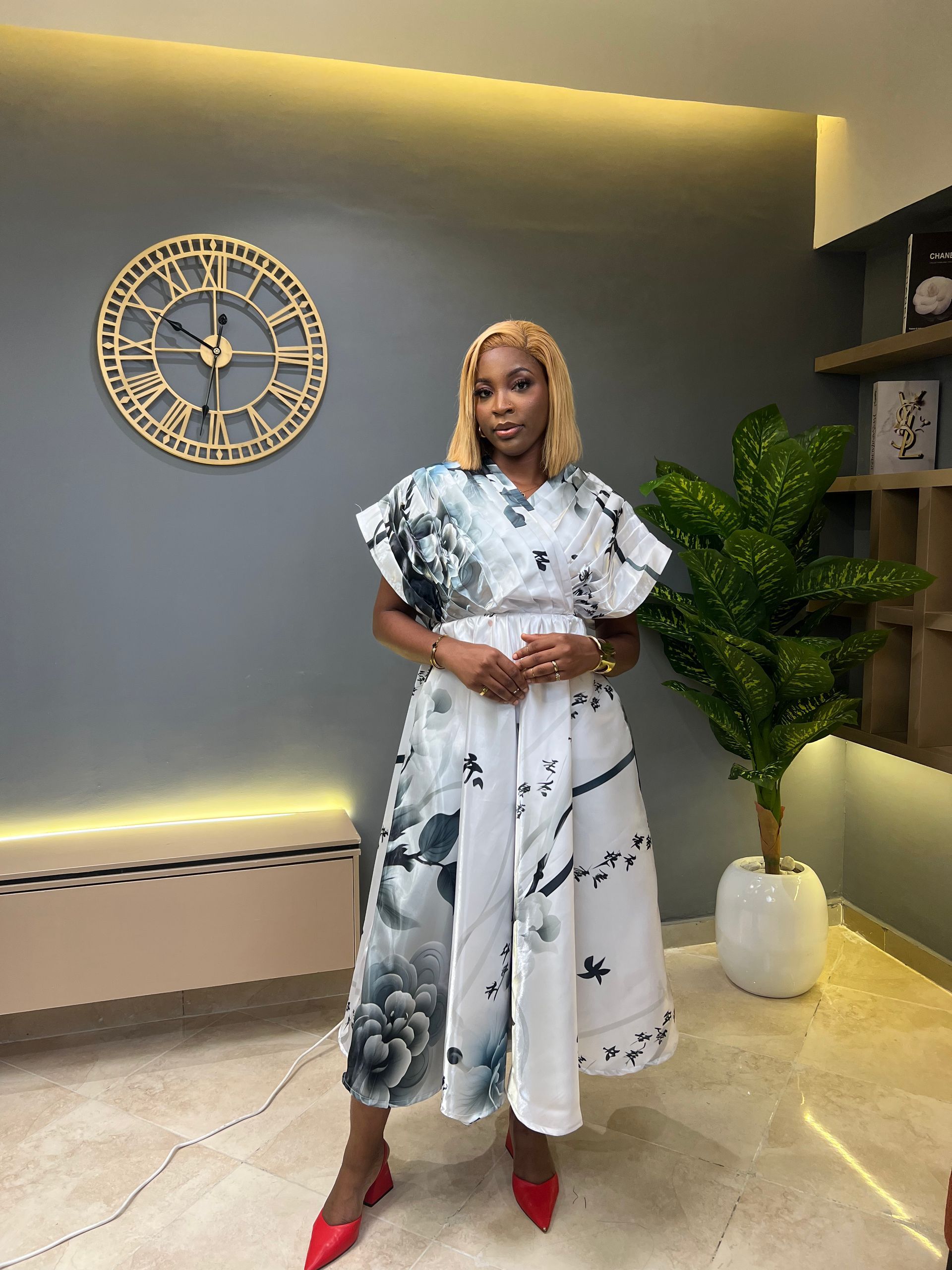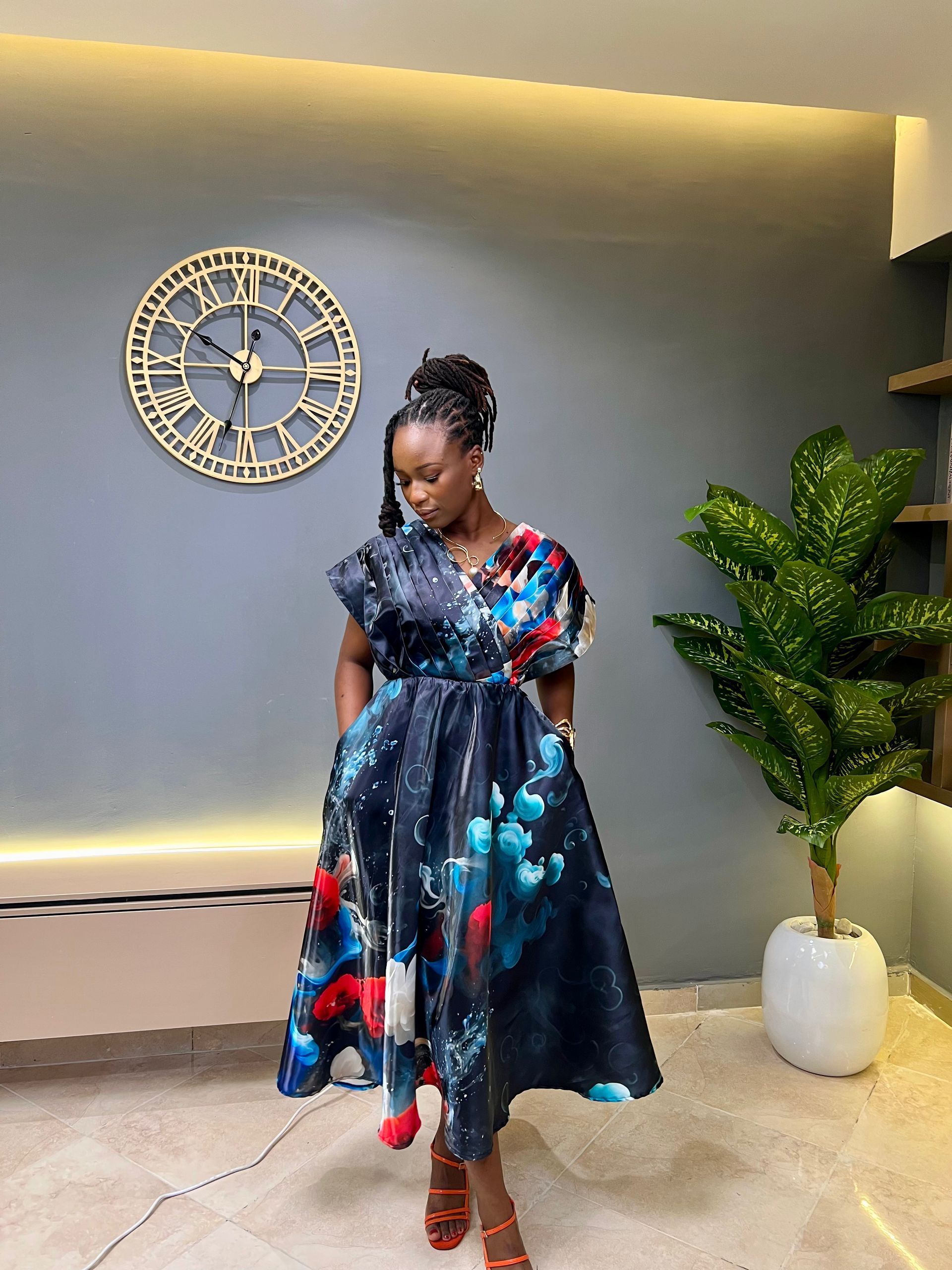 Ariella dress is made in flowered mikado, it's a draped wrap skater dress.