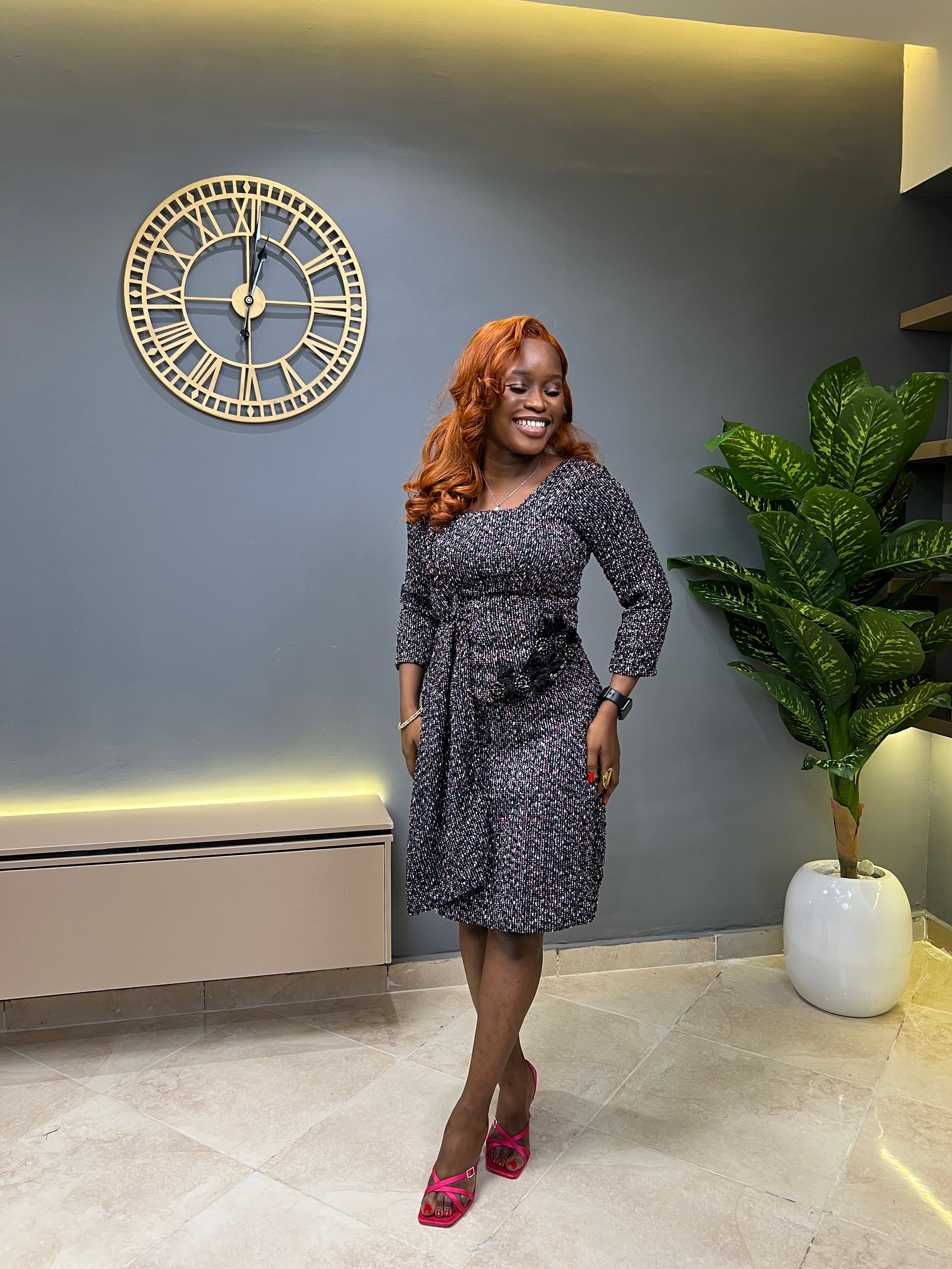 A bask blouse with drape from right shoulder with an embellished trimming on the hem paired with a knee length skirt made in tweed