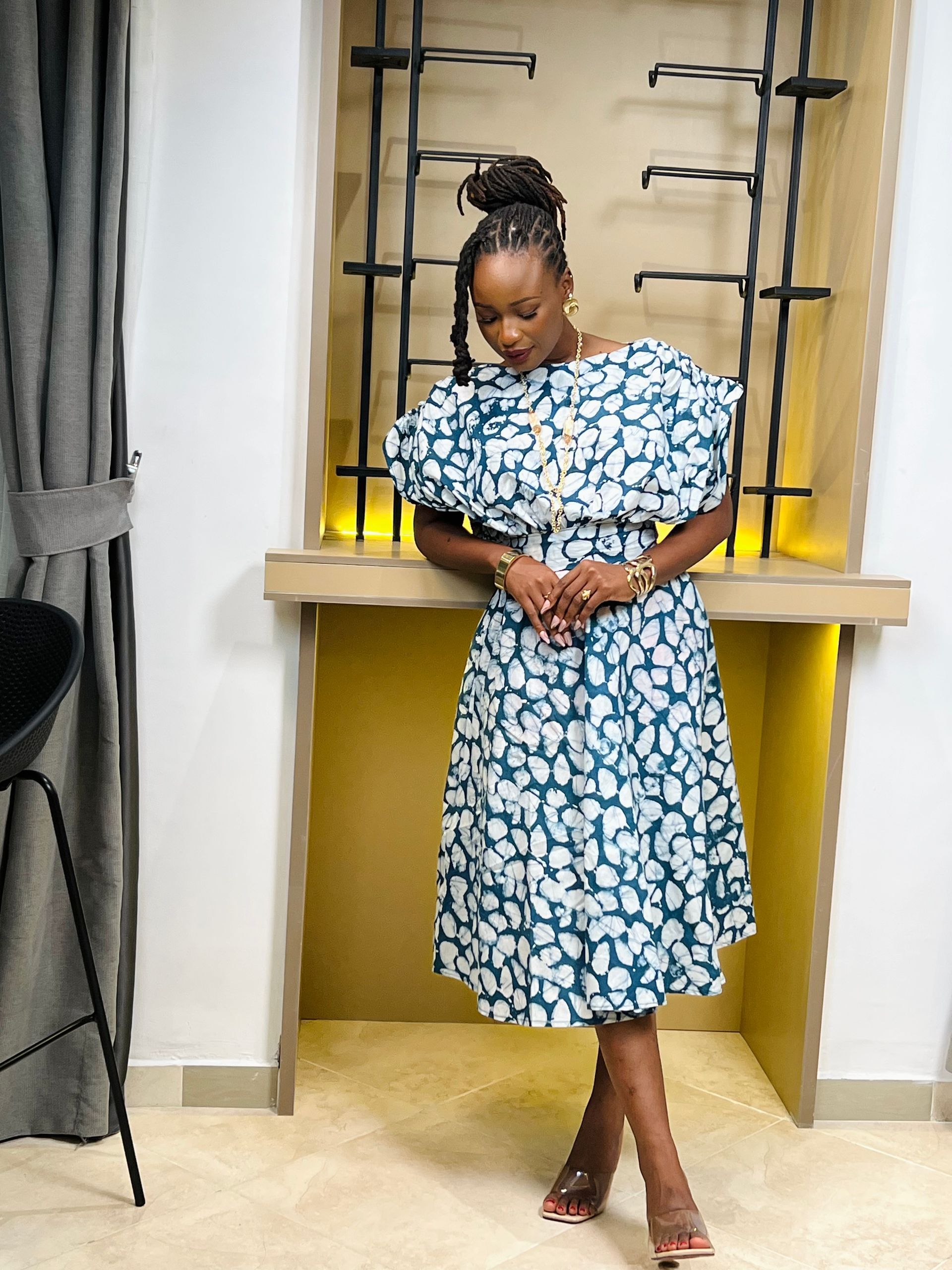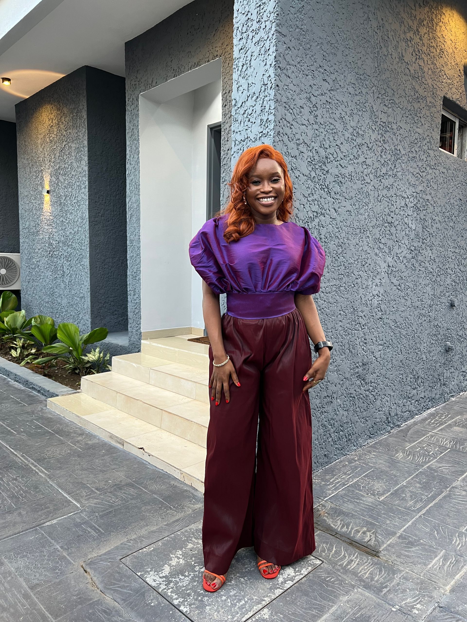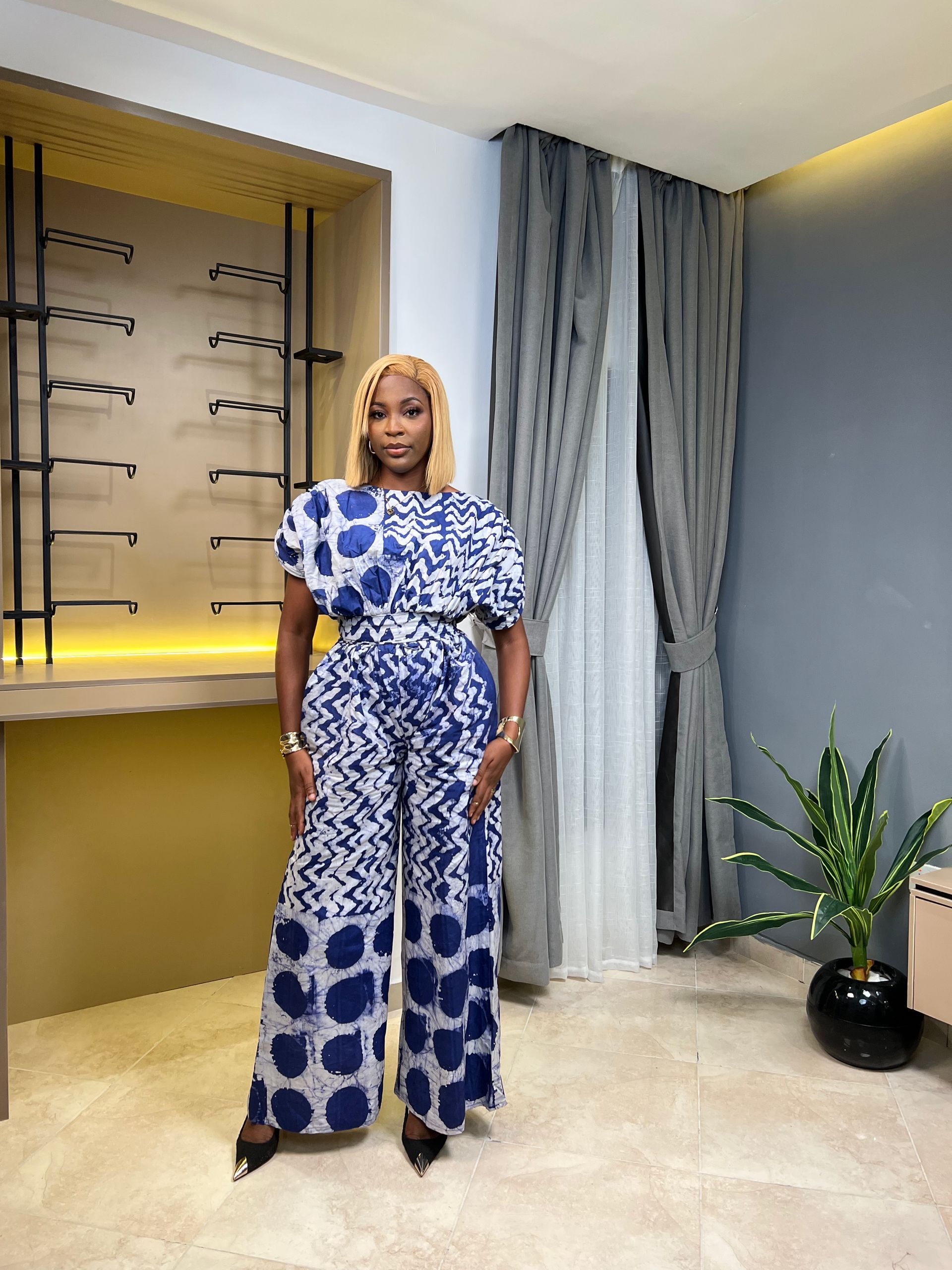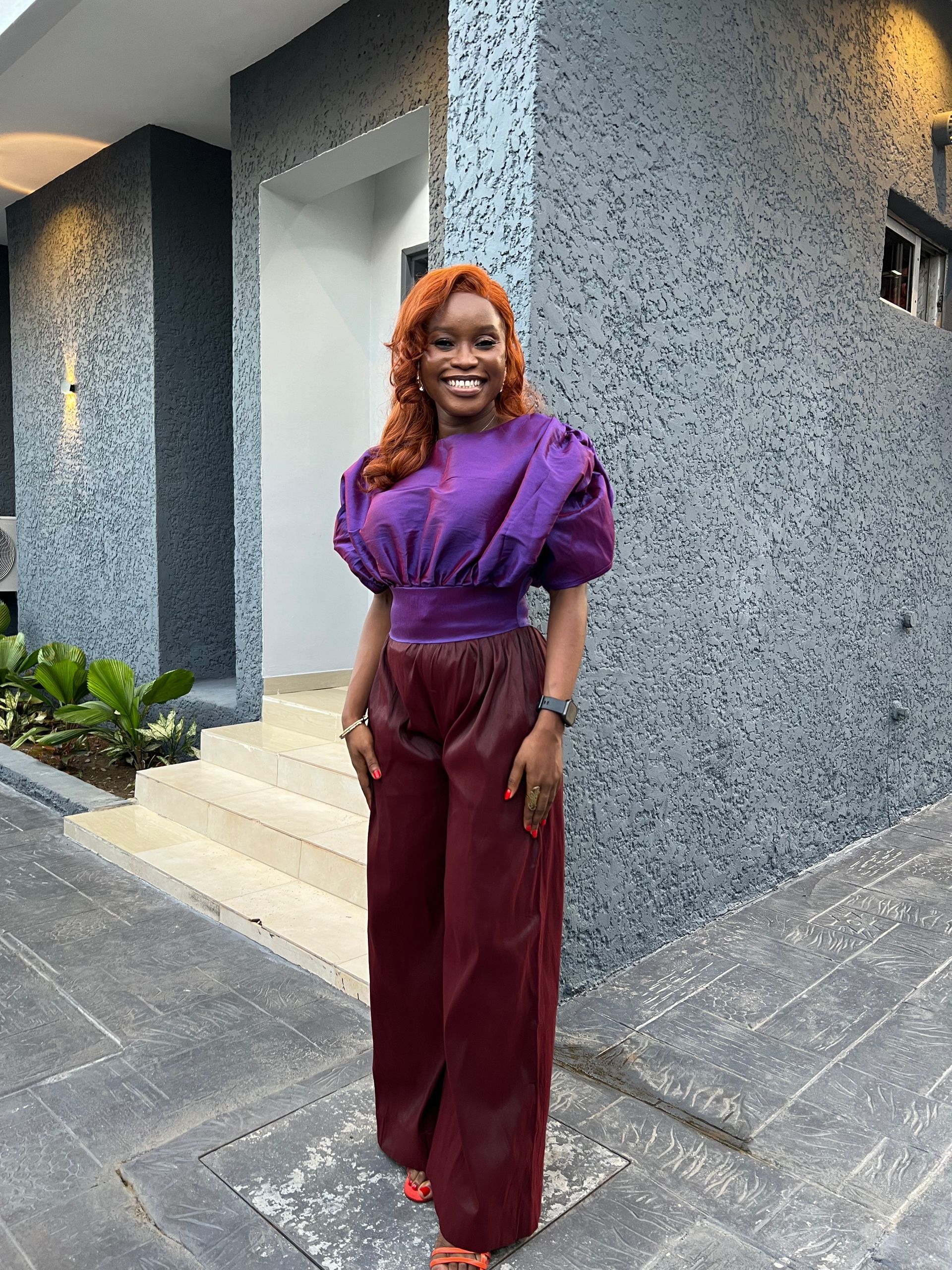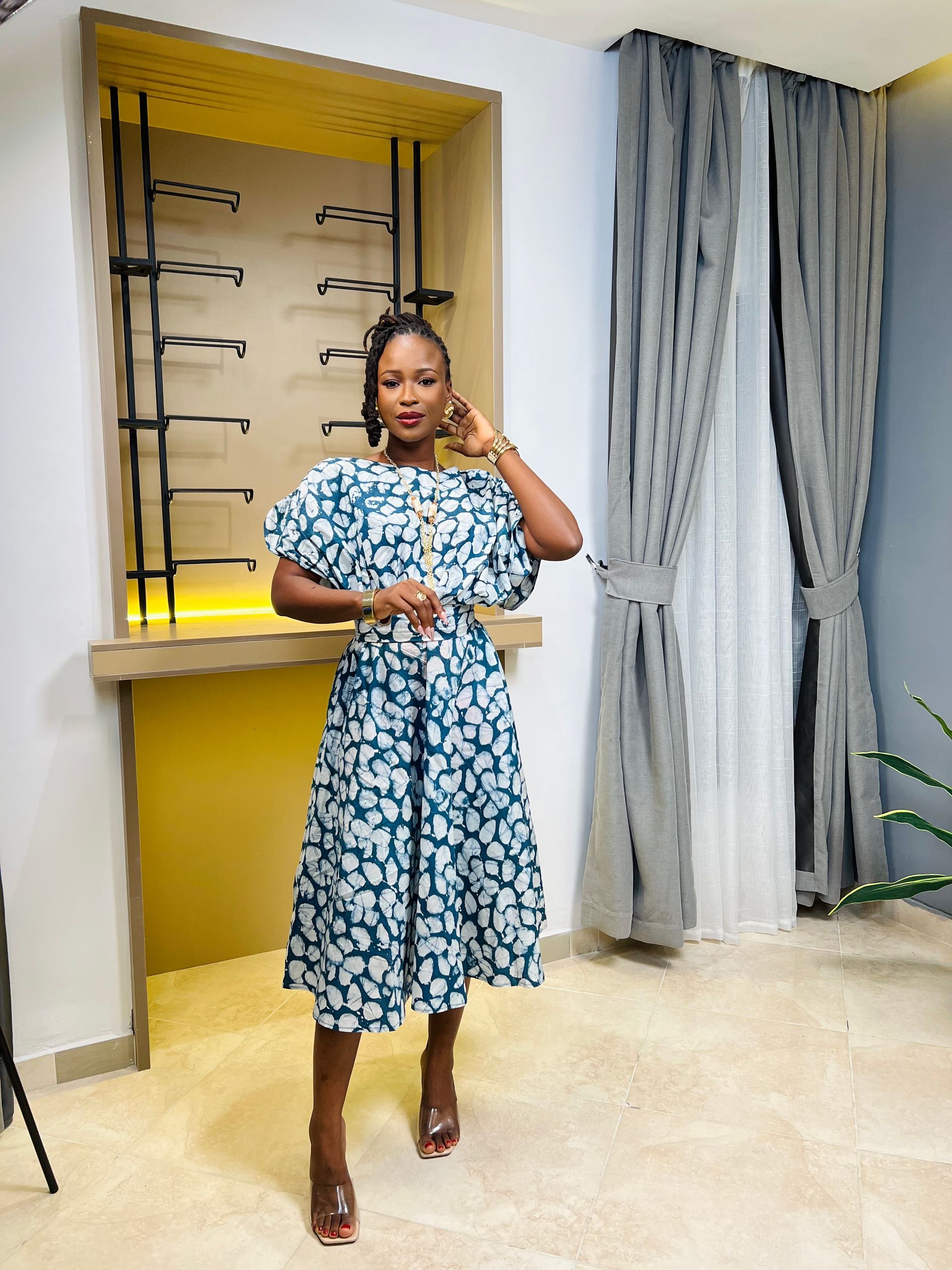 Keziah set is a puffy crop top paired with big pants or a flair skirt.